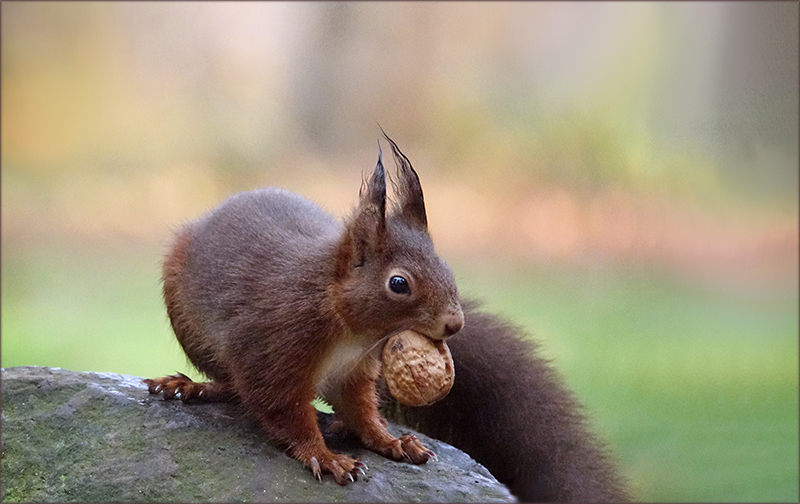 Die Nuß kommt vor dem dunklen Hintergrund des Schweifs gut zur Geltung.