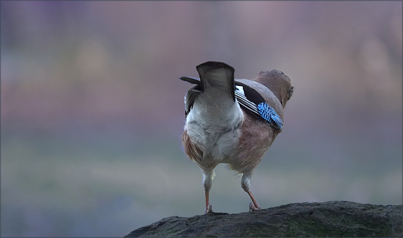 der dunklen Steinkuppe bereit stehende Eichelhäher, kommt