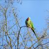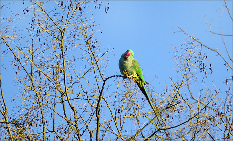 der Papagei im Sonnenschein hoch oben auf den Zweigen des