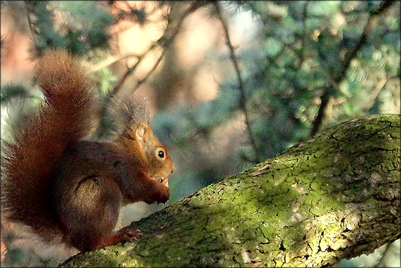 Immer, wenn mich etwas traurig macht, wie z.B. das derzeitige Geschehen hier auf unserem Planeten und sich ein Gefühl der Hilflosigkeit in mir ausbreitet, dann kommt mir der Wunsch in den Sinn, mich der Natur zuzuwenden. Zum einen hilft es mir, hier in der Galerie die schönen Bilder der Natur zu betrachten, auch dazu etwas zu schreiben, um davon auch wieder etwas weiterzugeben, und zum anderen, rausgehen in die Natur und die Seele mit frischer Energie aufzutanken, die die Natur in unbegrenzter Menge verströmt. Dabei kommen die Gedanken zur Ruhe, Liebe breitet sich aus und alles bedrohliche verliert seinen Schrecken, fällt ab, dann spüre ich eine tiefe Verbundenheit mit dem Universum, das unzerstörbar ist, und damit eine tiefe Verbundenheit mit den Menschen, den Tieren, den Bäumen und den Pflanzen...Das süße Eichhörnchen hier auf dem Bild, inmitten dieser wunderschönen Natur, von Bäumen, Ästen und Zweigen, im durchscheinenden Sonnenlicht, ist ein gutes Beispiel für das, was ich oben beschrieben habe, es bedarf gar keiner Worte, denn es spricht für sich selbst, für mich beglückend und schön.