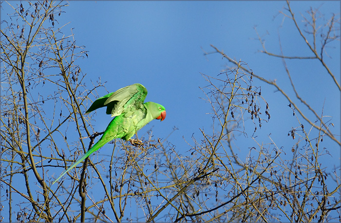 Papageien hier bei uns, in normalerweise für diese Vögel vom Klima her ungünstige Verhältnisse, ist schon bemerkenswert. Die Temperaturen haben sich so verändert, dass es eben doch möglich ist, nicht für alle einheimischen Arten und für die Natur immer zum Besten, aber davon abgesehen, gibt es auch sehr schöne Darbietungen, wie hier der Papagei im März, hoch oben auf den Zweigen der Bäume, der sich gerade niederlässt, Halt auf diesen wackeligen Zweigen sucht und mit noch ausgebreiteten Flügeln sich ausbalanciert. Gefällt mir sehr das Bild.