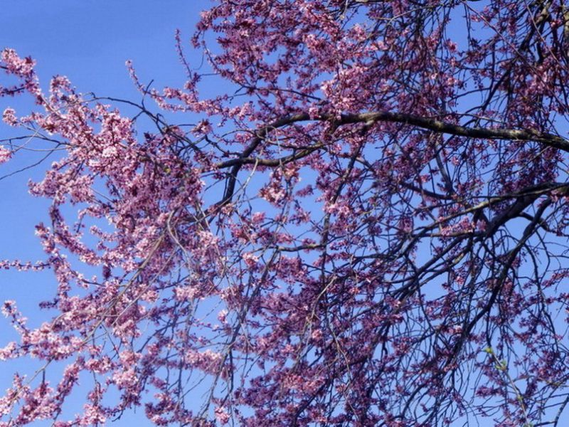Dunkele Zweige, rosarote Blüten, blauer Himmel und frische Luft, Frühling.