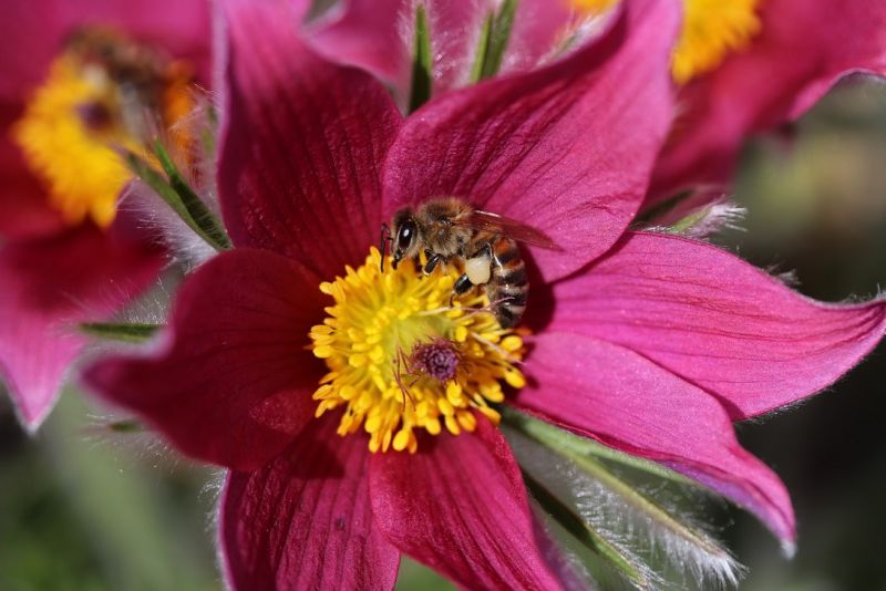 Schaue ich mir die Biene an auf den gelben Staubgefäßen,