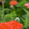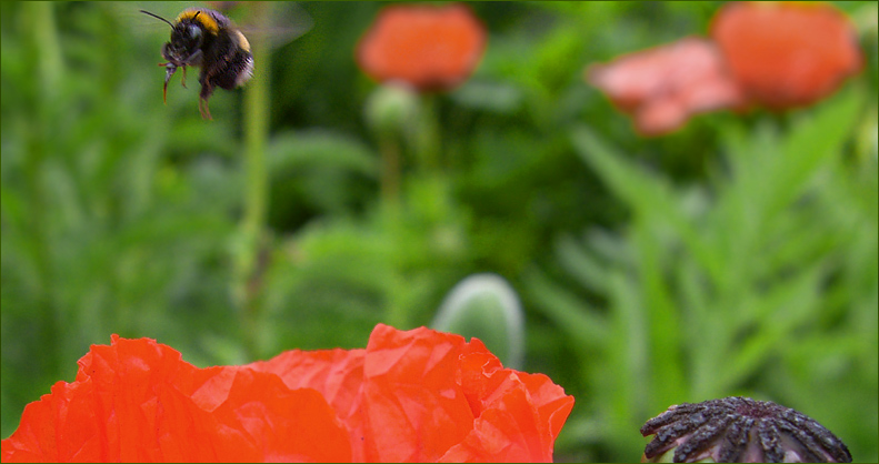 Beim Anflug einer Mohnblüte fotografiert. Ein solches Foto ist reine Glücksache, denn Hummeln fliegen sehr schnell und mitunter auch im Zickzack