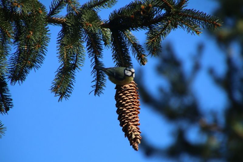 Das sieht witzig-ungewöhnlich aus. Die Meise krallt sich direkt an den Zapfen. Und der Zapfen hängt solo direkt an dem benadelten Zweig. Sehe ich das so alles richtig?