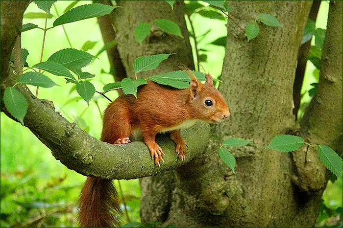 In dem kommentierten Foto gefällt mir zu sehen, wie sich das Hörnchen auf dem Ast positioniert hat, wie es sich mit den Vorderpfoten abstützt. So unterschiedlich die Äste vom Ausmaß (Durchmesser) und von der Oberfläche her sind - mit seinen Pfötchen und seiner gesamten Beweglichkeit kommt es überall im Baum bestens zurecht.