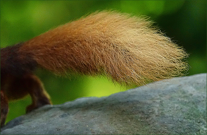 Gestern habe ich auch nur Schwänze von dem Eichhörnchen bei uns gesehen. Es waren zwei Katzen da, die auf der Lauer lagen. Das Eichhörnchen zitterte und wagte sich nicht runter. Da hat es dieses Eichhörnchen besser