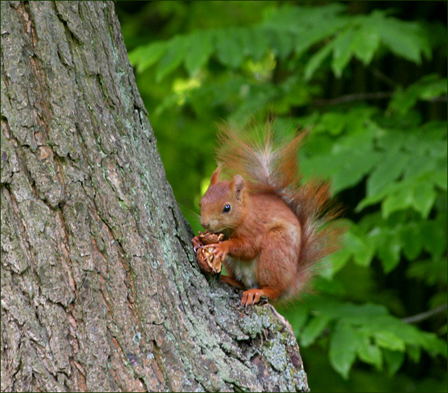 Tannenzapfen werden von Eichhörnchen vorsichtig, aber schnell zerlegt; dabei hebt es die einzelnen Schuppen an, um an die nahrhaften Samen zu gelangen. Auch für den Menschen giftige Samen (z.B. Eibensamen) stehen auf dem Speiseplan. Besonders energiereich sind die Fichtenzapfen; bis zu 100 Fichtenzapfen kann ein Eichhörnchen pro Tag verspeisen; durchschnittlich sind es 80 – 100g am Tag.