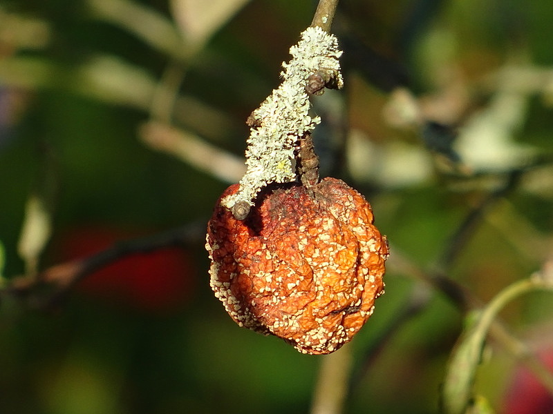 Dieser Apfel ist vermutlich erst am Baum faul geworden und danach ist er getrocknet.