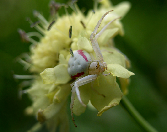 "Für ihre Beute ist die Spinne fast unsichtbar und so gerät das Beutetier fast in Körperkontakt, bevor die Krabbenspinne Honigbienen und andere Blüten bestäubende Insekten mit ihren kräftigen beiden vorderen Beinpaaren packt. Die Krabbenspinne vermeidet dabei den Stachel der größeren Beute und beißt Wespen und Bienen in den Nacken. Das Gift ihrer Kieferklauen ist sehr wirksam. Im Gegensatz zu den netzbauenden Spinnenarten sehen und erkennen Krabbenspinnen ihre Beute aus 10 bis 20 cm Entfernung, nachdem sie schon vorher durch niederfrequenten Luft- und Substratschall wahrgenommen wurde."