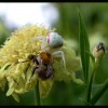 Ich bin heute nochmals zu der Stelle gegangen wo die Krabbenspinne in der Blüte auf Beute lauerte. Und, oh Schreck, was sehe ich? Sie hat eine Hummel getötet!