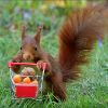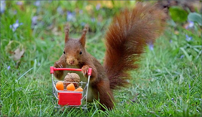 Sie stellte ihn, gefüllt mit Nüssen und kleinen Möhren, in die Wiese. Ich habe von den sehr interessanten Reaktionen des Eichhörnchens viele Fotos gemacht. Wahrscheinlich mache ich ein EBOOK mit kleinen Kommentaren zu den Schnappschüssen.