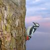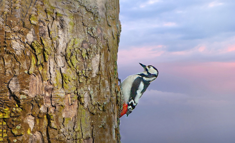 Bunter Specht und bunter Himmel, der auch sehr malerisch wirkt. Tolles Foto