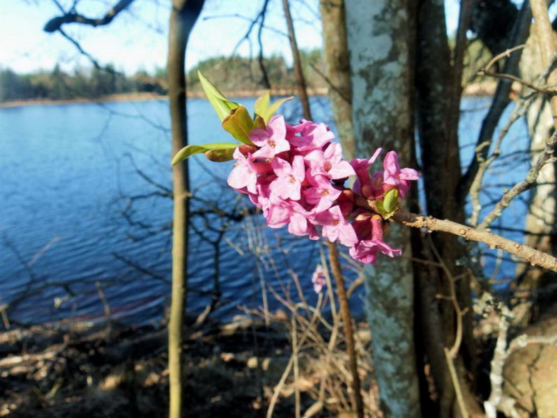 Wunderschöne rosarote Blütentraube im Sonnenlicht, vor den Baumstämmen und dem blauen Wasserspiegel, ein Bild des Friedens, fürs Herz.