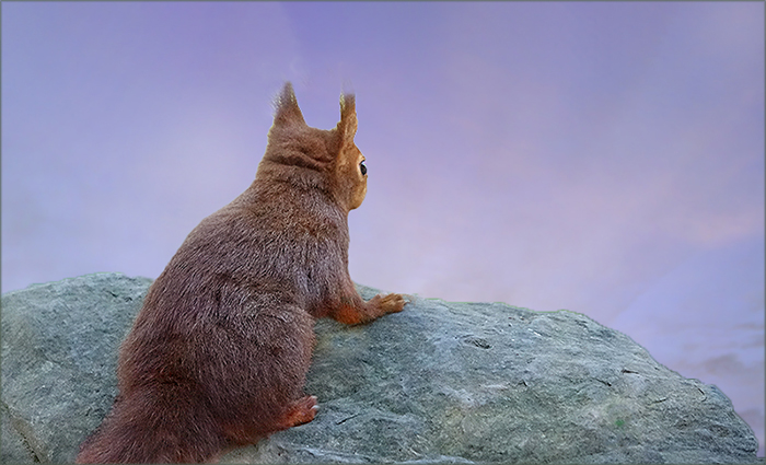 Der Stein wirkt leicht grünlich, der Himmel... so etwas nennt man wohl Zwielicht und das kakaobraune Hörnchen (Weiß ist nicht zu sehen - wenn man es nicht wüßte...)