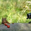 Auf dem Stein liegen Zwieback, Erdbeere, Tomate und Haselnuss.