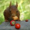 Zuerst futterte das Eichhörnchen den Zwieback, danach die Erdbeere und Haselnuss. Die Tomate wurde verschmäht