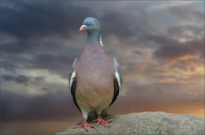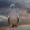 Durch den dunkel bewölkten Himmel kommen die Farben der Taube sehr gut zur Geltung.