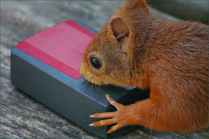 Das Eichhörnchen weiss ganz genau, daß sich in dieser Box die begehrten Nüsse befinden.