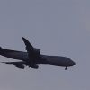 Das Flugzeug hat Lichter an und wirkt grau vor dem dunklen Himmel. Nachts oder spät abends ist alles grau.