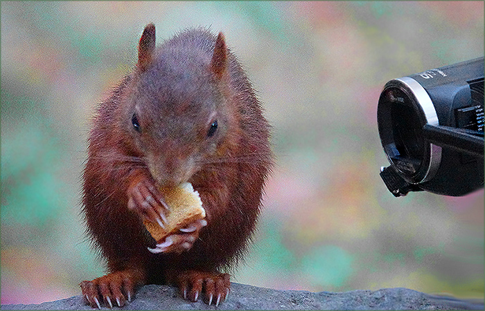 ein kleiner, batteriebetriebener Heizlüfter, der so aussieht, wie diese Kamera und entsprechend aufgestellt werden kann. Wenn es dann das Eichhörnchen als angenehm empfindet, sich knabbernd mit den verschiedenen Verpflegungen länger auf dem Stein aufzuhalten, kann man bestimmt sehr gute Aufnahmemotive finden.