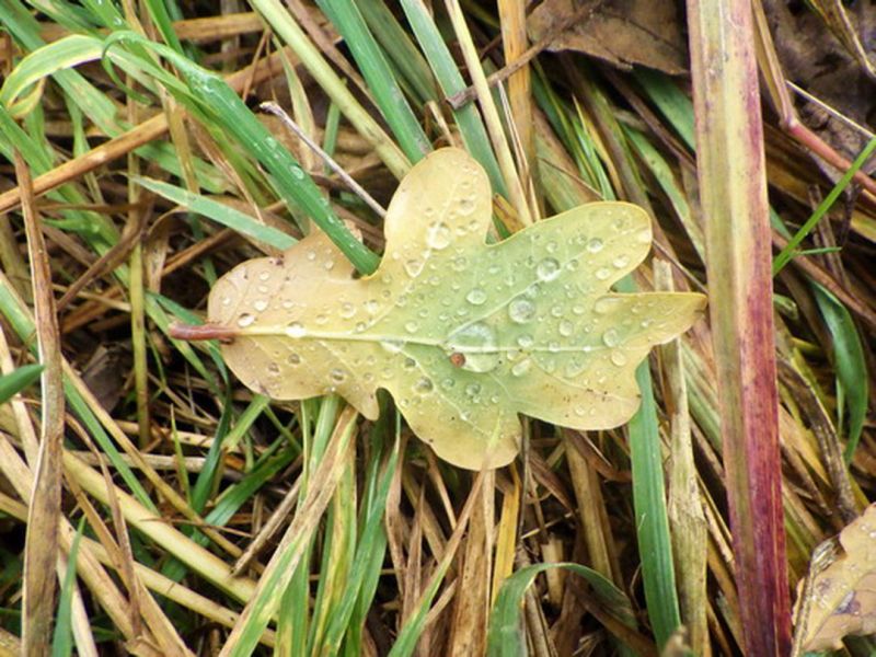 Schön, wie sich die unterschiedlichen Blatt-Formen begegnen. Die Tropfen sind unterschiedlich groß, aber niemals kantig (außer an der Begrenzung zur Trägerfläche) .