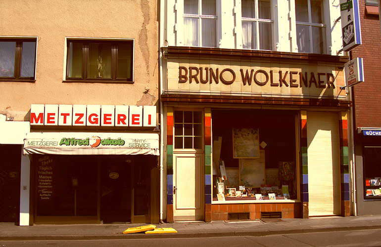 Der Laden Wolkenaer (rechts) ist in der City Kölns ältester Laden für Künstlerbedarf. Er wurde von den Bombenanggriffen im 2. Weltkrieg nicht zerstört. Dort kaufen heute Künstler wie Sigmar Polke, Gerhard Richter und H. A. Schult ihre Farben und Leinwände.
