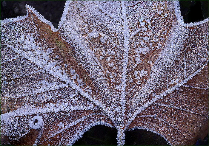 Mit dem Blatt als Leinwand, mit dem Wasser aus der Luft als Farbe und mit dem Frost als Maler entstand ein wunderschönes Bild.