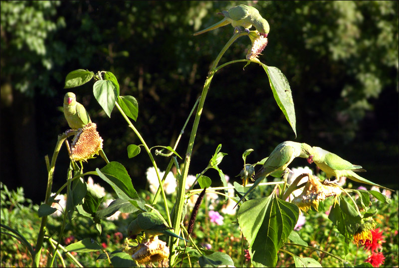 Sie passen hervorragend zum grünen Blattwerk - wenn sie den Schnabel halten und kein so aufmerksamer Beobachter wie Peter Lauster des Wegs kommt, sind alle Sonneblumen entkernt, bevor jemand etwas bemerkt...