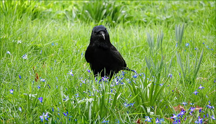 Die Blausterne geben dem Aussehen der Wiese und dem Raben