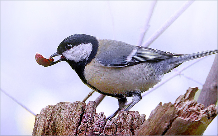 Ich kenne solche Szenen - wenn die Vögel beginnen etwas zum Zerteilen zu bearbeiten, hämmern sie emsig mit dem Schnabel los. Irgendwann bald stellt sich der Erfolg ein und dann schnappen sie ihre Eroberung und fliegen schnell damit davon, an einen sicheren Ort.