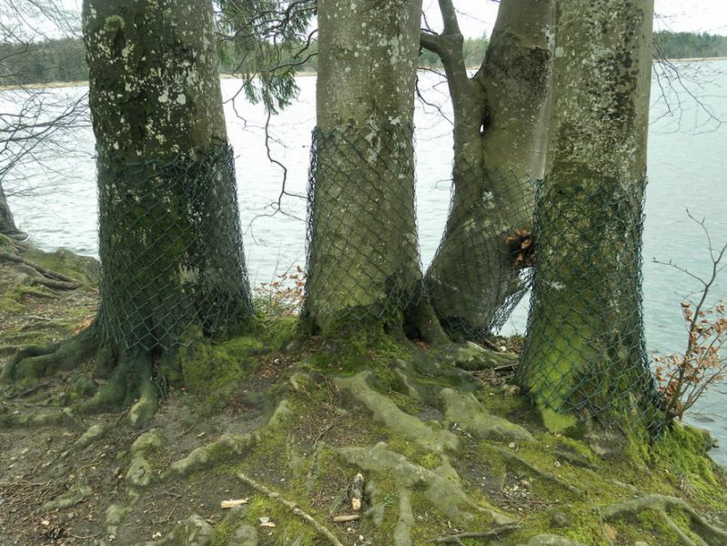 Wenn viele Bäume mit derartigen Drahtverkleidungen am See stehen - vielleicht sollte man neue Sorten von Bäumen züchten, die im unteren Bereich außen eine metallene Panzerrinde haben werden.