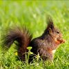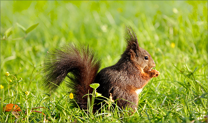 In dem grünen frischen Gras und noch dazu was zu knabbern, da fühlt sich das Eichhörnchen wohl