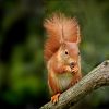 Sitzt, ohne sich mit den "Händen" festzuhalten, auf einem Ast und knabbert eine Haselnuß.