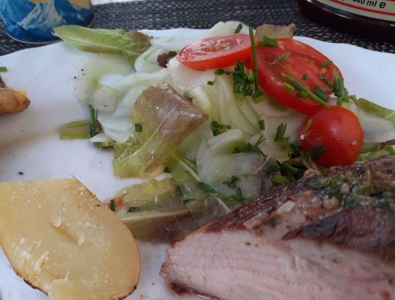 Vom grill übersiedelte das grillgut für 5 minuten in eine feuerfeste glasschüssel mit butter, knoblauch, majoran und rosmarin