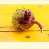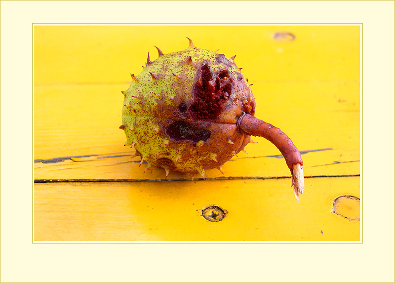 Auf einen gelben Gartentisch gefallen. Die Schale ist noch nicht aufgeplatzt, aber ein Eichhörnchen hat wohl schon an ihr genagt...