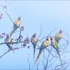 Die gewundenen Zweige umspielen die 3 rechts sitzenden Vögel.
