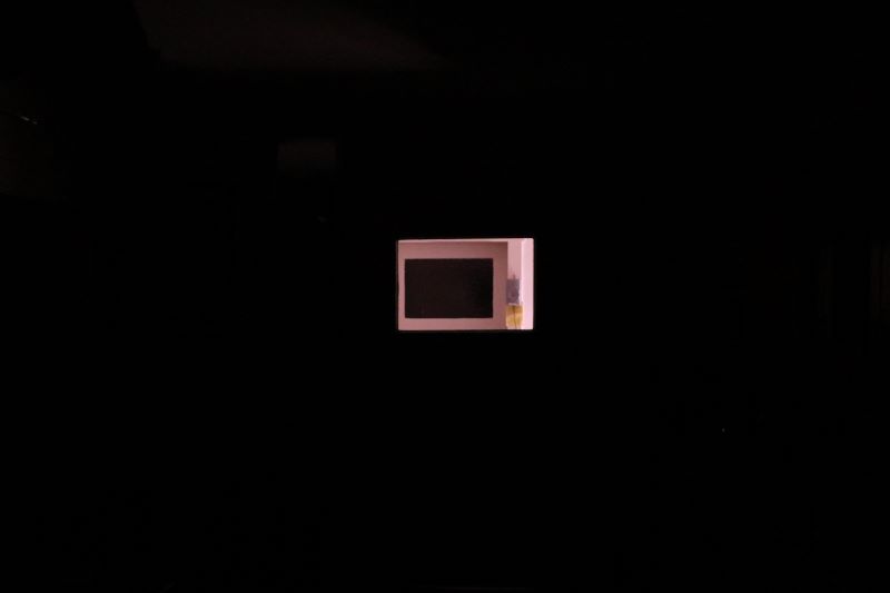 Aus der dunklen küche durch das türglas in den gang geschaut
