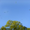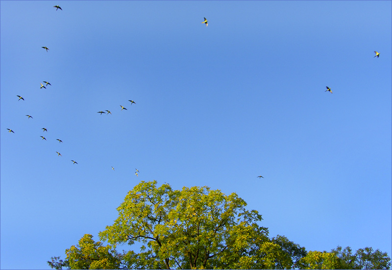 Das muss ja ein tolles Erlebnis gewesen sein. Ich zähle sogar 24 Papageien. Über der Baumkrone kann ich auch noch einen erkennen. Schöner als Ballons.