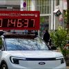 Dieser PKW mit der Zeitanzeigetafel (1:46:37) auf dem Dach fuhr 50 m hinter dem ersten Läufer Demeke Tadesse.