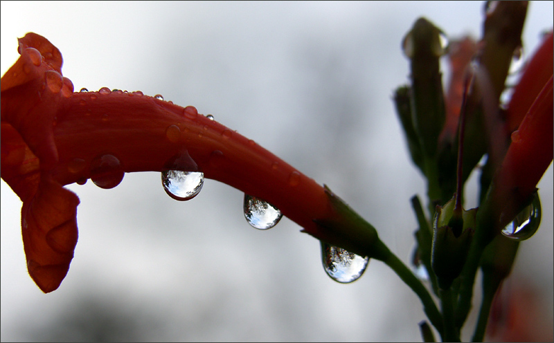 Das ist ja ein kleines Kunstwerk. In den Regentropfen spiegeln sich die Wolken wieder. Schön.