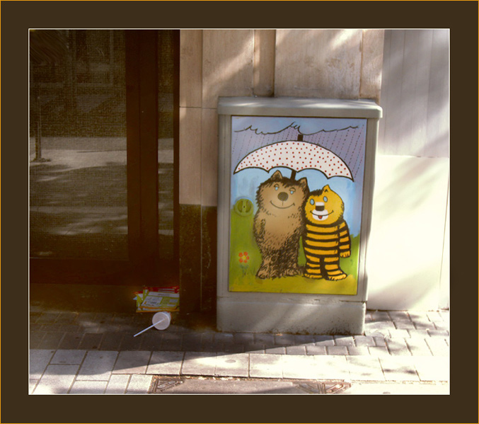 Diese Malerei auf einem Servicekasten der Telekom in der Kölner City wurde von einem unbekannten Kölner Künstler im Stil von Janosch auf diesen Kasten gemalt. Dieses lustige Motiv musste ich einfach fotografieren, weil es mich spontan sehr angesprochen hat.