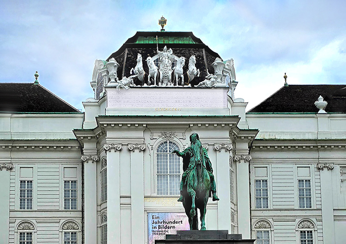 Das ist die Österreichische Nationalbibliothek - sie ist die öffentlich zugängliche, zentrale wissenschaftliche Bibliothek Österreichs. Als Nationalbibliothek sammelt sie unter anderem die Pflichtexemplare aller in Österreich erschienen oder hergestellten Druckwerke. Das Denkmal Kaiser Josef II steht vor dem Eingang zur Bibliothek.