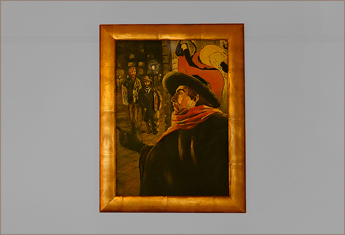 Artistide Bruant war ein französischer Kabarettsänger, Schriftsteller, Komödiant und Nachtklubbesitzer, der durch die kreativen Plakate 1892 von Henri de Toulouse-Lautrec, auf denen er im roten Schal und schwarzen Mantel zu sehen ist, berühmt wurde. Auf der linken Seite laufen van Gogh und Toulouse-Lautrec mit Bildern unterm Arm im nächtlichen Paris auf Artistide Bruant zu.