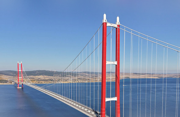 Das ist die Çanakkale-Brücke. Sie überspannt die Dardanellen und verbindet die europäische Halbinsel Gelibolu mit der asiatischen Stadt Lapseki. Es ist die längste Hängebrücke der Welt, sie wurde im März 2022 eröffnet.
