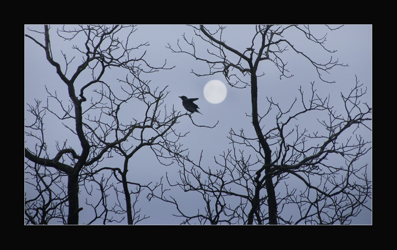 Das bläliche Grau im Hintergrund, das Tiefschwarze des Raben, das im Hell des Mondes in einem gräulichen Schwarz erscheint.