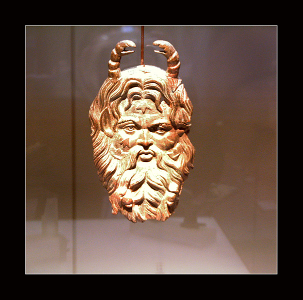 Diesen aus einer Metallplatte herausziselierten Kopf habe ich in einer Glasvitrine gesehen.