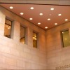 Eine schlichte Architektur. Durch die Deckenbeleuchtung bekommt der Eingang eine warme Atmosphäre.