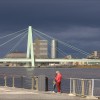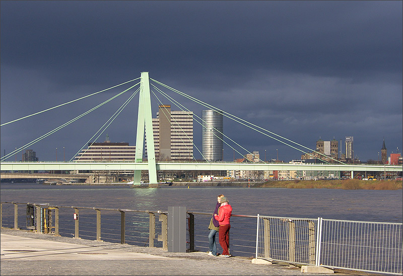 tolle Kontraste der Severinsbrücke zum dunklen Himmel und der beiden Mädels zum grau/trüben Rhein...