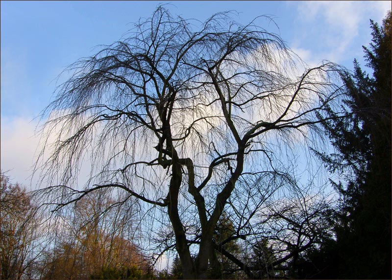 Vor dem freundlich blauweißen Himmel kommen die schwarzen Äste und Zweige besonders schön und zart zur Geltung.